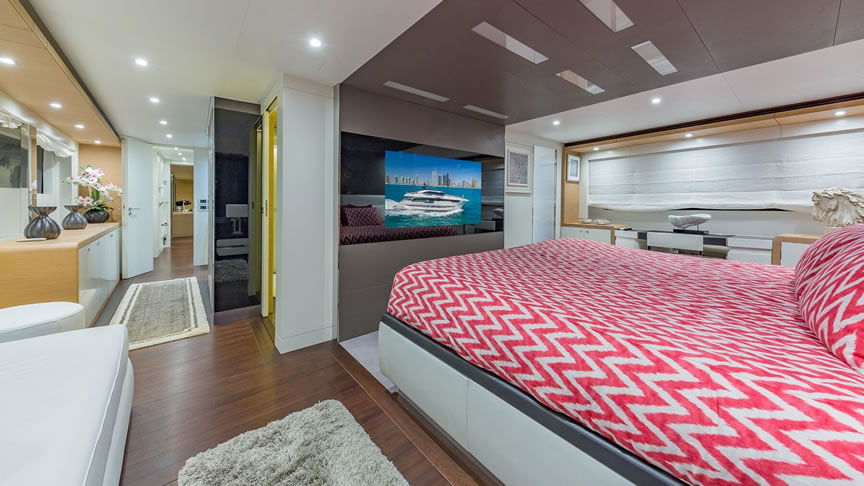 Enjoy a yacht rental in Miami on this boat. With its alluring white deck and wood finish, this boat is truly elegant. Breathtaking views of sea and sky can be seen from every area of this great craft. Plenty of space for lounging or resting can be found here as well as a bar on the outside for drinking or dining, making it perfect for hosting any luck friends! Every detail of this boat has been designed to provide comfort and class; from the indoor bar to the master stateroom, you'll feel at home aboard this magnificent vessel.
